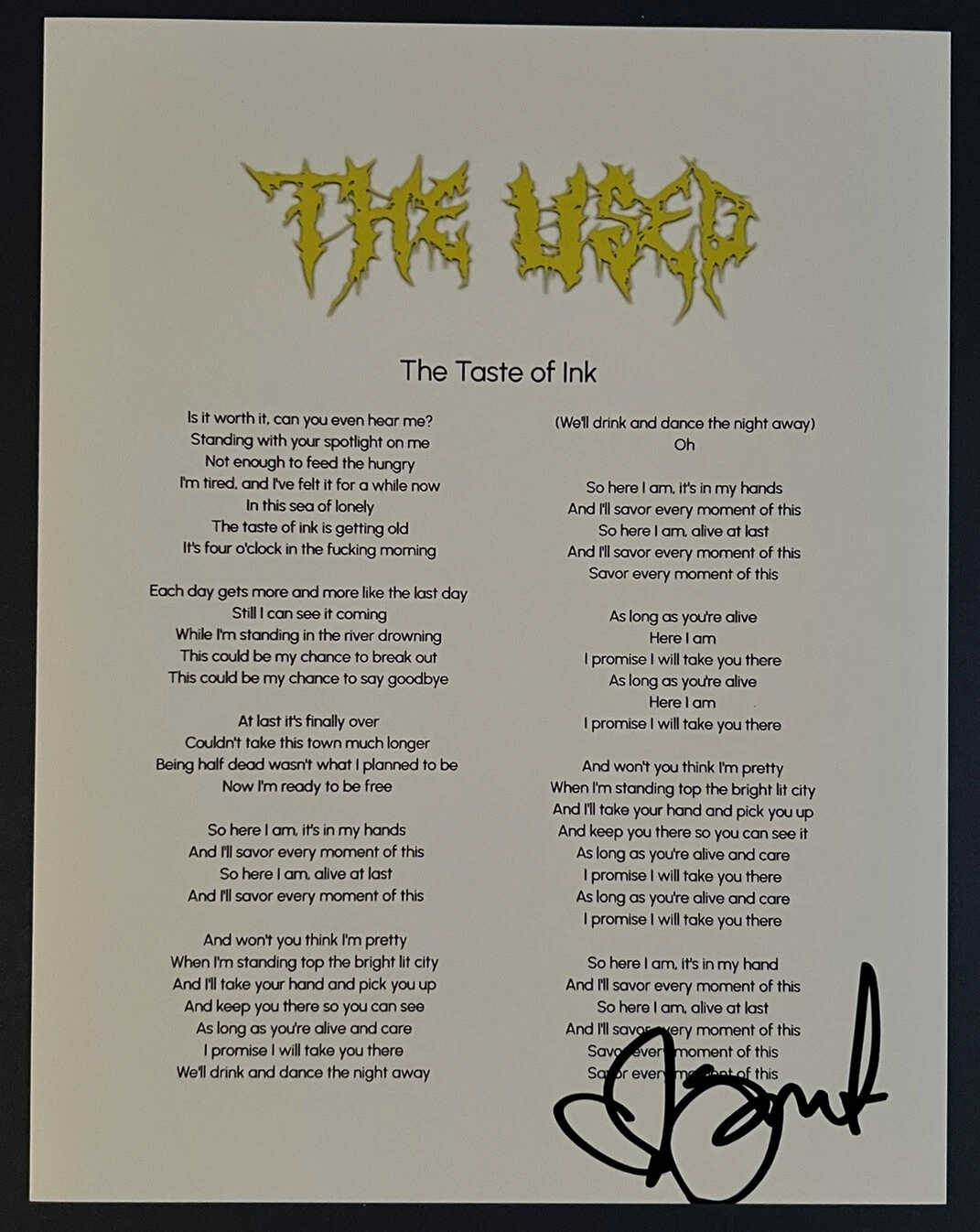 BERT MCCRACKEN SIGNED LYRIC SHEET THE USED SINGER AUTHENTIC AUTOGRAPH COA