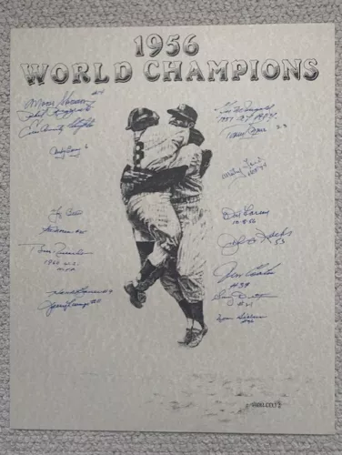 1956 NY YANKEES HAND SIGNED 16×20 LITHO+COA 17 SIGS+INSCRIPTIONS YOGI+LARSEN COLLECTIBLE MEMORABILIA