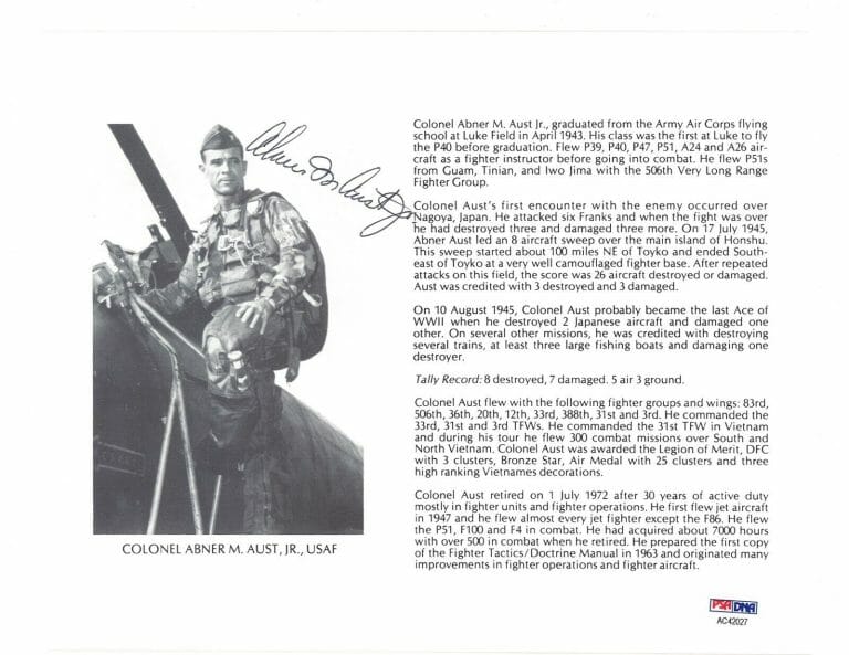 ABNER AUST JR SIGNED 8X10 (D) PSA DNA AC42027 WWII ACE 8 KILLS COLLECTIBLE MEMORABILIA
