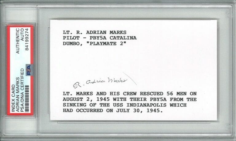 ADRIAN MARKS SIGNED INDEX CARD PSA DNA 84199274 (D) WWII PBY5A USS INDY RESCUE COLLECTIBLE MEMORABILIA