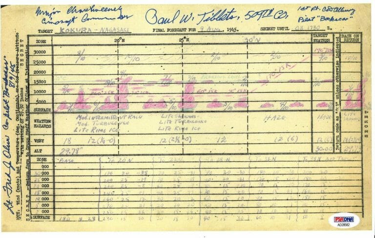 BOCKCAR C-15 CREW SIGNED FINAL FORECAST 8/9/45 PSA DNA AD28582 X4 COLLECTIBLE MEMORABILIA
