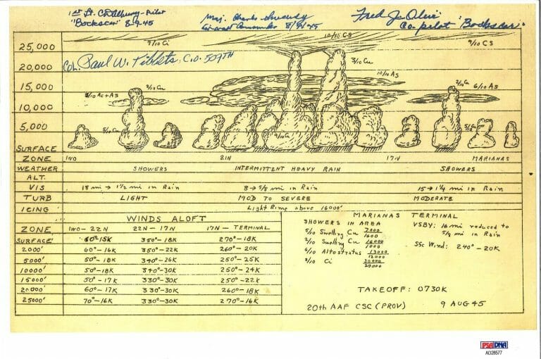 BOCKSCAR CREW MULTI SIGNED WEATHER FORECAST 8/9/1945 PSA DNA AD28577 (D) RARE COLLECTIBLE MEMORABILIA