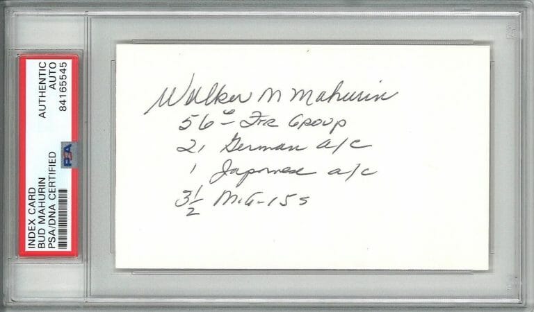 BUD MAHURIN SIGNED INDEX CARD PSA DNA 84165545 (D) WWII ACE 56TH FG COLLECTIBLE MEMORABILIA