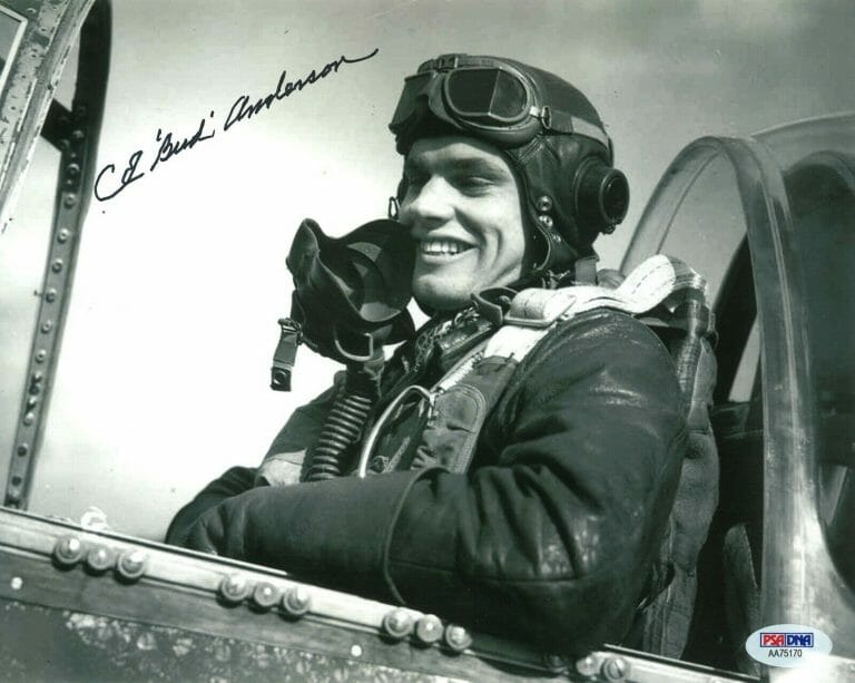 CE BUD ANDERSON SIGNED 8X10 PSA DNA WWII P-51 ACE 16.25 KILLS COCKPIT IMAGE COLLECTIBLE MEMORABILIA