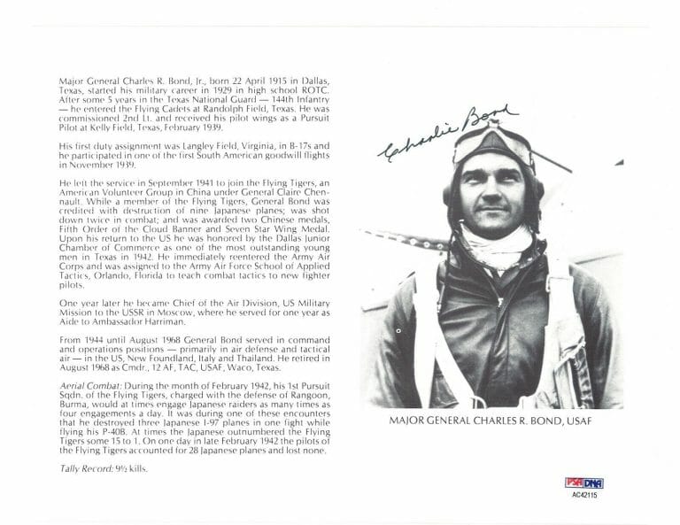 CHARLES BOND SIGNED 8X10 (D) PSA DNA AC42115 WWII ACE 9.5 KILLS AVG FLYING TIGER COLLECTIBLE MEMORABILIA