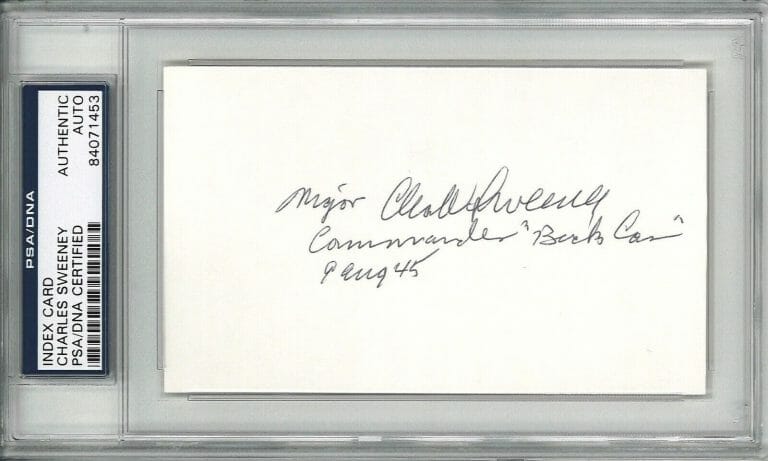 CHARLES SWEENEY SIGNED INDEX CARD PSA DNA 84071453 (D) ATOMIC BOMB BOCKSCAR C-15 COLLECTIBLE MEMORABILIA