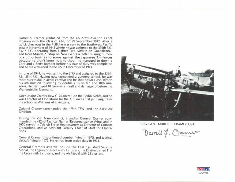 DARRELL CRAMER SIGNED 8X10 (D) PSA DNA AC42233 WWII ACE 13 KILLS COLLECTIBLE MEMORABILIA