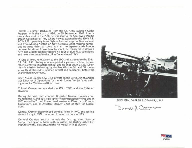 DARRELL CRAMER SIGNED 8X10 (D) PSA DNA AC42234 WWII ACE 13 KILLS COLLECTIBLE MEMORABILIA