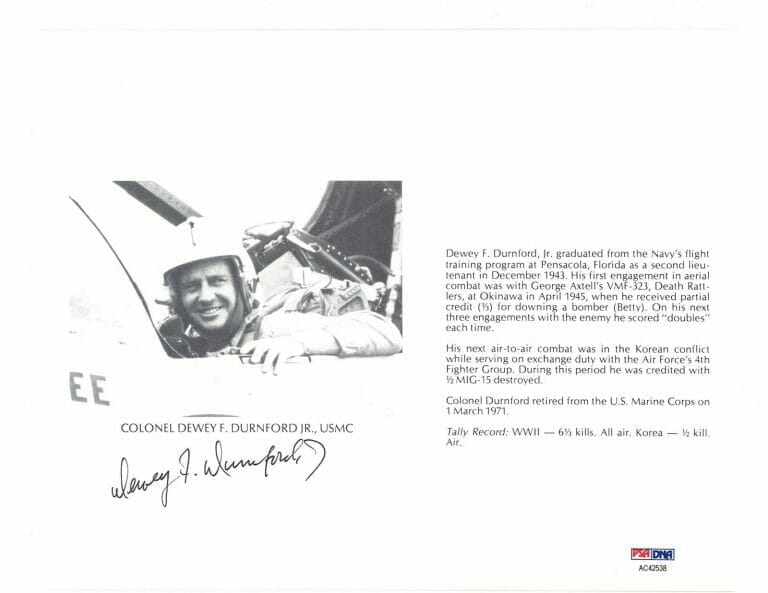 DEWEY DURNFORD SIGNED 8X10 PSA DNA AC42538 (D) WWII WAR ACE 6 1/3 KILLS USMC COLLECTIBLE MEMORABILIA
