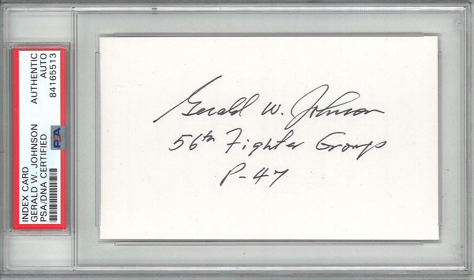 GERALD JOHNSON SIGNED INDEX CARD PSA DNA 84165513 (D) WWII ACE 56TH FG COLLECTIBLE MEMORABILIA