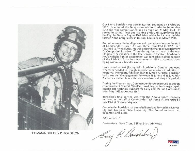 GUY BORDELON SIGNED 8X10 (D) PSA DNA AC42117 KOREAN WAR ACE 5 KILLS COLLECTIBLE MEMORABILIA