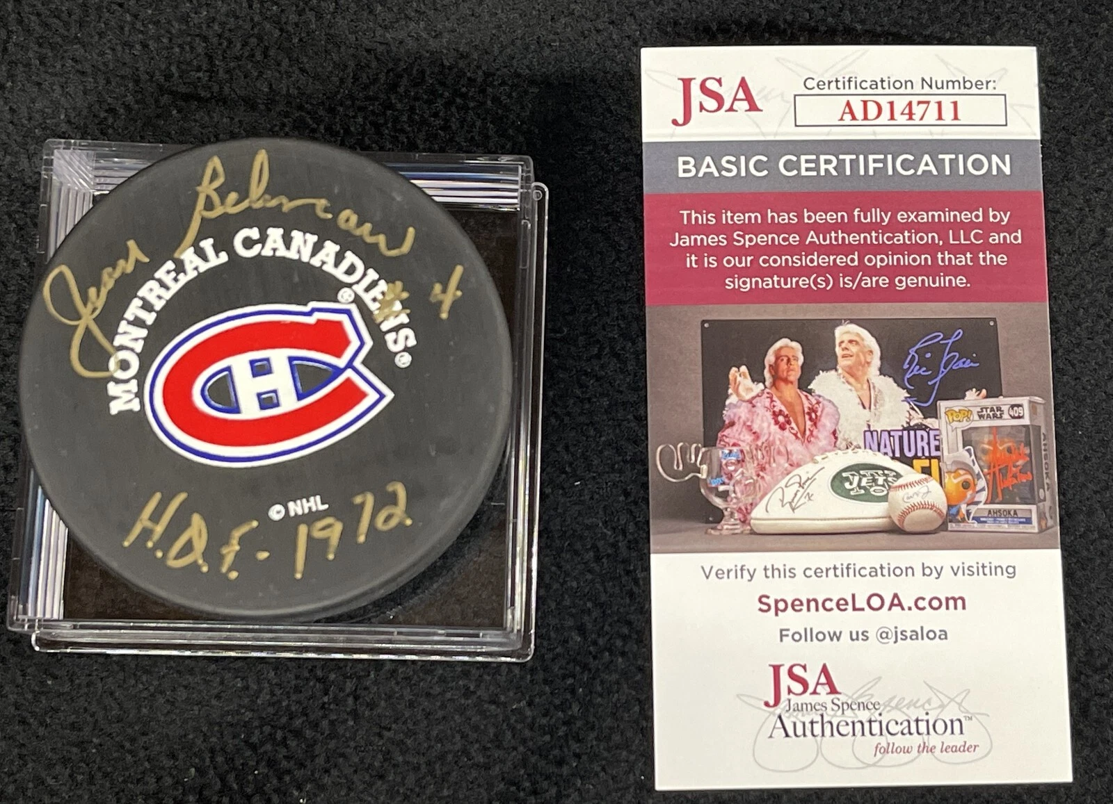 JEAN BELIVEAU SIGNED & INSCRIBED MONTREAL CANADIENS TRENCH PUCK JSA COA AD14711 COLLECTIBLE MEMORABILIA