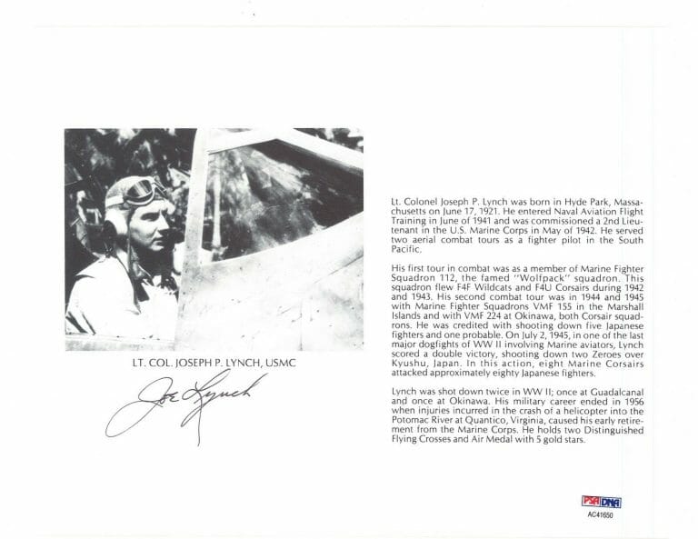 JOSEPH LYNCH SIGNED 8X10 (D) PSA DNA AC41650 WWII ACE 5 KILLS COLLECTIBLE MEMORABILIA