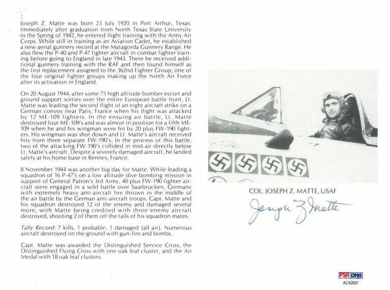 JOSEPH MATTE SIGNED 8X10 (D) PSA DNA AC42697 WWII ACE 7 KILLS COLLECTIBLE MEMORABILIA