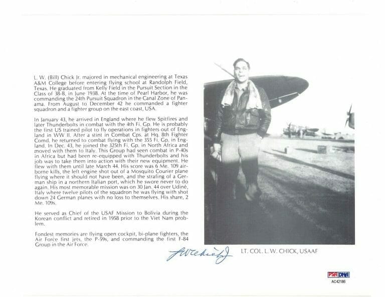 L.W. CHICK JR SIGNED 8X10 (D) PSA DNA AC42186 WWII ACE 6 KILLS COLLECTIBLE MEMORABILIA