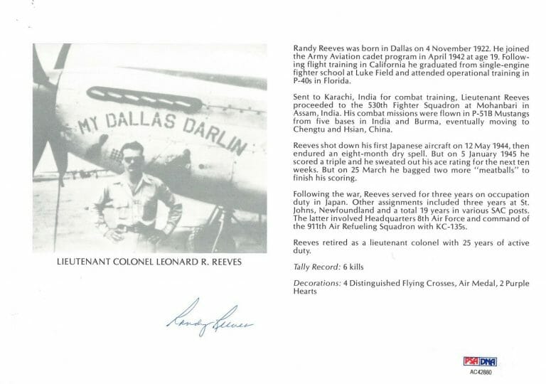 LEONARD RANDY REEVES SIGNED 8X10 (D) PSA DNA AC42880 WWII ACE 6 KILLS COLLECTIBLE MEMORABILIA
