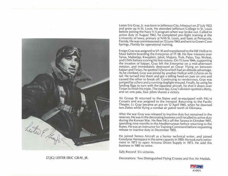 LESTER GRAY JR SIGNED 8X10 (D) PSA DNA AC42673 WWII ACE 5.25 KILLS COLLECTIBLE MEMORABILIA