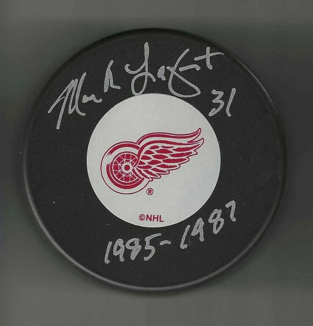 MARK LAFOREST SIGNED & INSCRIBED DETROIT RED WINGS VINTAGE LOGO PUCK COLLECTIBLE MEMORABILIA