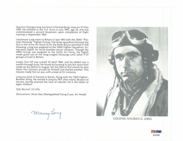 MAURICE LONG SIGNED 8X10 (D) PSA DNA AC41629 WWII ACE 5.5 KILLS COLLECTIBLE MEMORABILIA