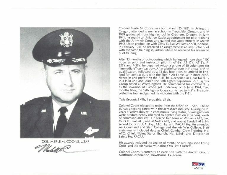 MERLE COONS SIGNED 8X10 (D) PSA DNA AC42222 WWII ACE 5 KILLS COLLECTIBLE MEMORABILIA