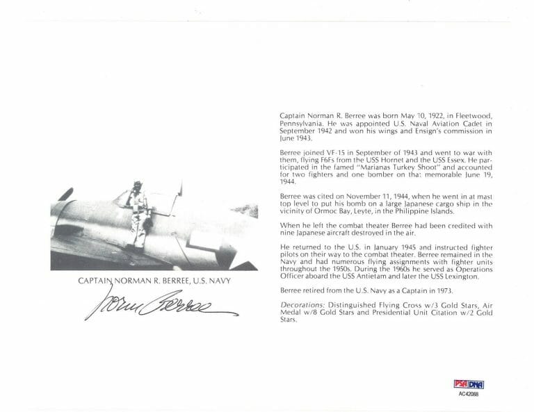 NORMAN BERREE SIGNED 8X10 (D) PSA DNA AC42088 WWII ACE 9 KILLS COLLECTIBLE MEMORABILIA