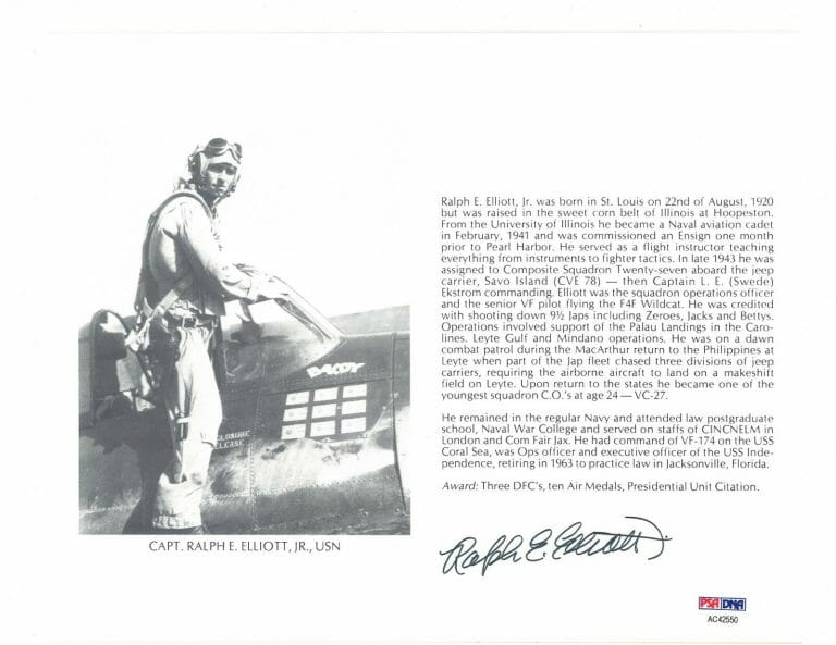 RALPH ELLIOTT JR SIGNED 8X10 (D) PSA DNA AC42550 WWII ACE 9.5 KILLS COLLECTIBLE MEMORABILIA