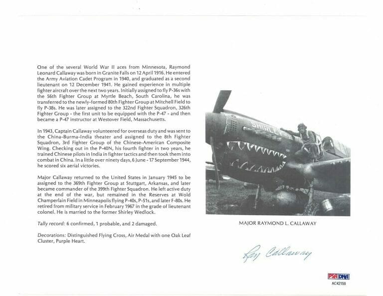RAY CALLAWAY SIGNED 8X10 (D) PSA DNA AC42159 WWII ACE 6 KILLS COLLECTIBLE MEMORABILIA