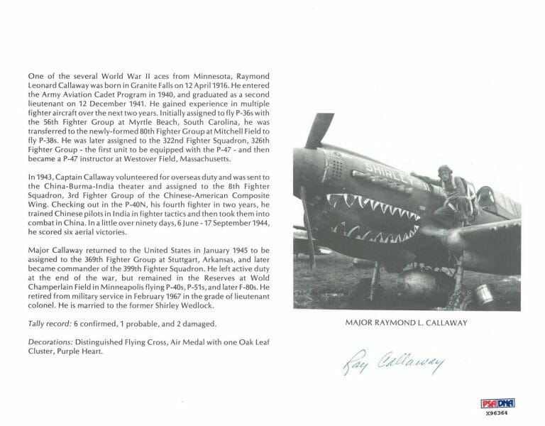 RAY CALLAWAY SIGNED 8X10 (D) PSA DNA X96364 WWII ACE 6 KILLS COLLECTIBLE MEMORABILIA