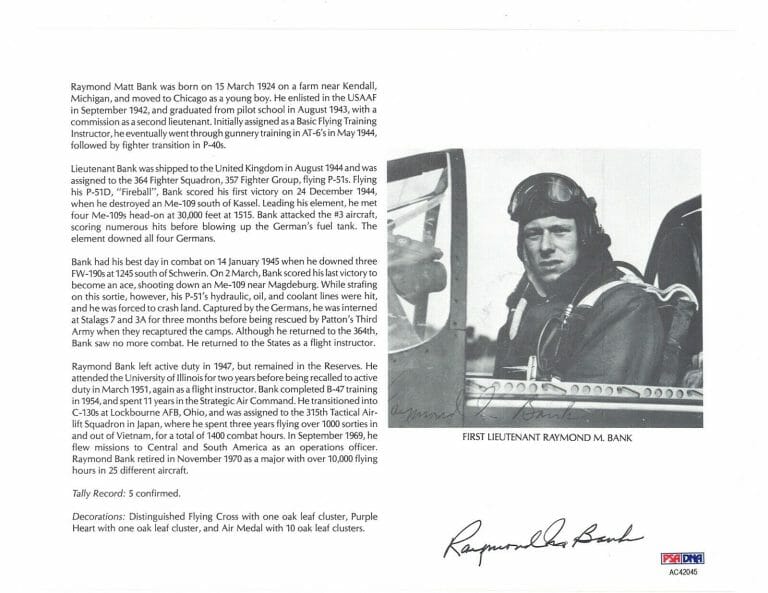 RAYMOND BANK SIGNED 8X10 PSA DNA AC42045 WORLD WAR II ACE 5 KILLS COLLECTIBLE MEMORABILIA