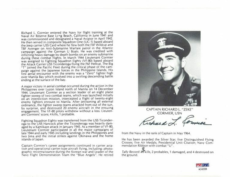 RICHARD CORMIER SIGNED 8X10 (D) PSA DNA AC42228 WWII ACE 8 KILLS COLLECTIBLE MEMORABILIA