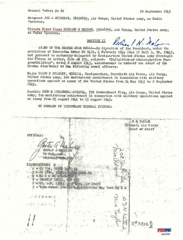RICHARD NELSON SIGNED SILVER STAR DOCUMENT PSA DNA AD07650 (D) ENOLA GAY COLLECTIBLE MEMORABILIA