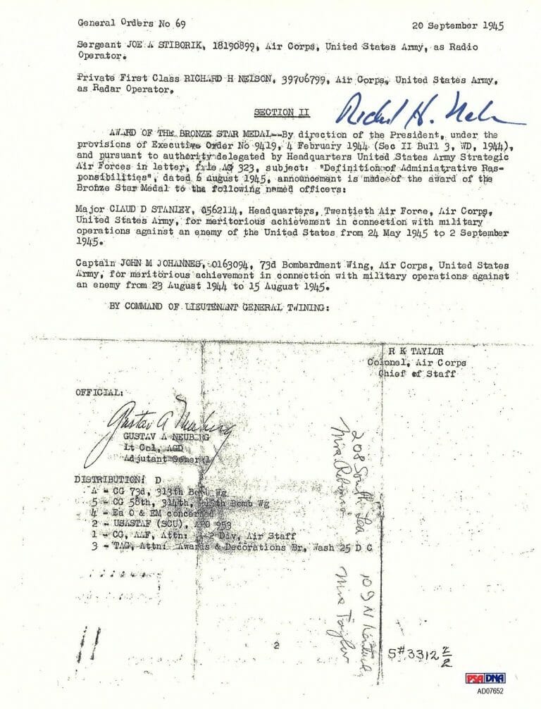 RICHARD NELSON SIGNED SILVER STAR DOCUMENT PSA DNA AD07652 (D) ENOLA GAY COLLECTIBLE MEMORABILIA