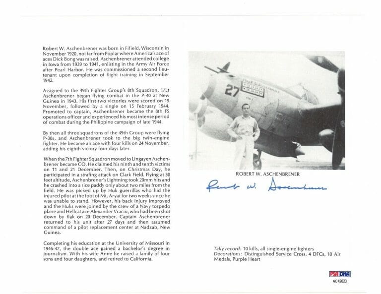 ROBERT ASCHENBRENER SIGNED 8X10 (D) PSA DNA AC42023 WWII WAR ACE 10 KILLS COLLECTIBLE MEMORABILIA