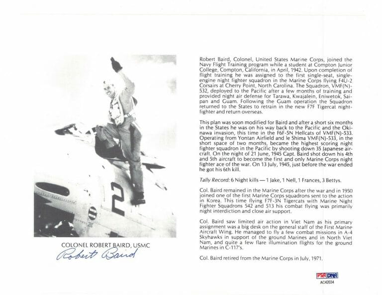ROBERT BAIRD SIGNED 8X10 (D) PSA DNA AC42034 WWII WAR ACE 6 KILLS COLLECTIBLE MEMORABILIA