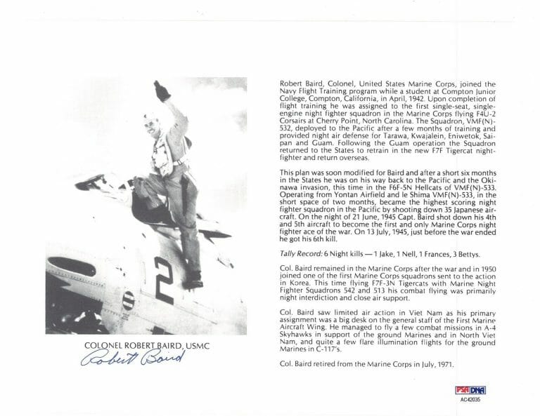 ROBERT BAIRD SIGNED 8X10 (D) PSA DNA AC42035 WWII WAR ACE 6 KILLS COLLECTIBLE MEMORABILIA