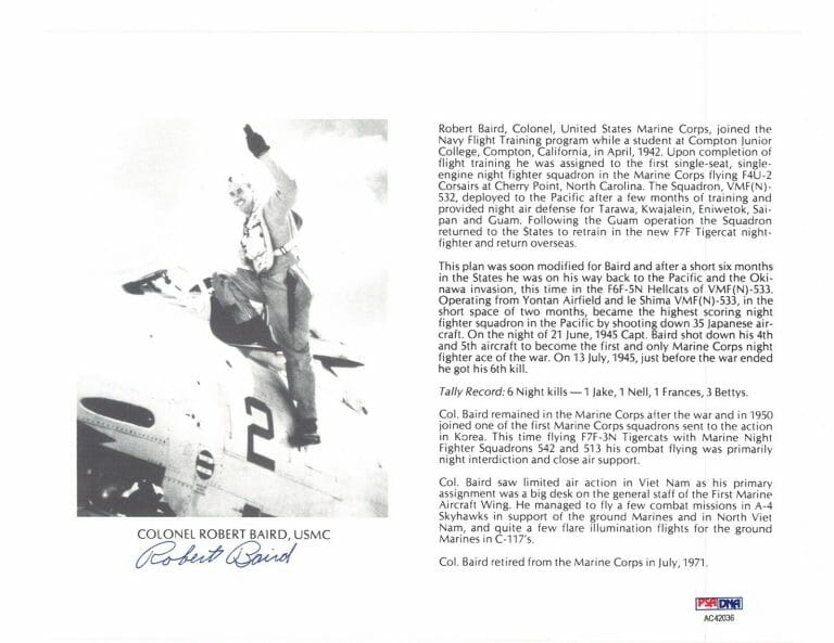ROBERT BAIRD SIGNED 8X10 (D) PSA DNA AC42036 WWII WAR ACE 6 KILLS COLLECTIBLE MEMORABILIA