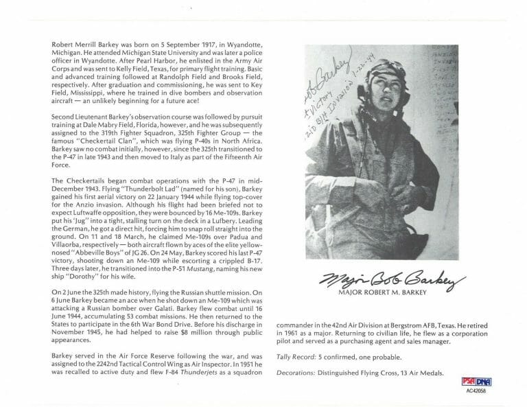 ROBERT BARKEY SIGNED 8X10 (D) PSA DNA AC42058 WWII ACE 5 KILLS COLLECTIBLE MEMORABILIA