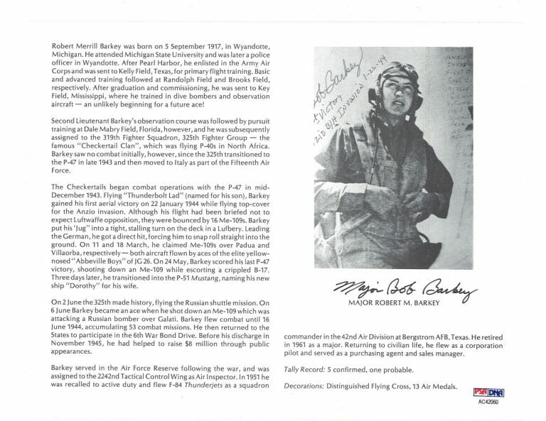 ROBERT BARKEY SIGNED 8X10 (D) PSA DNA AC42060 WWII ACE 5 KILLS COLLECTIBLE MEMORABILIA