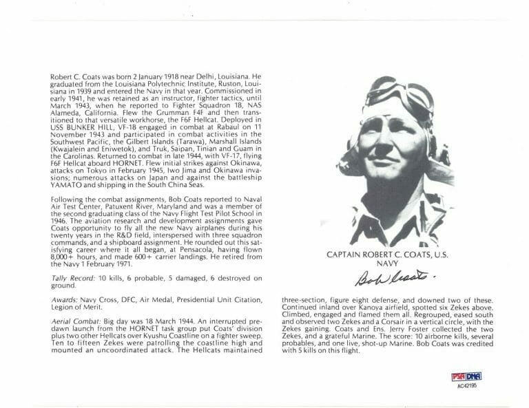 ROBERT COATS SIGNED 8X10 (D) PSA DNA AC42195 WWII ACE 10 KILLS COLLECTIBLE MEMORABILIA