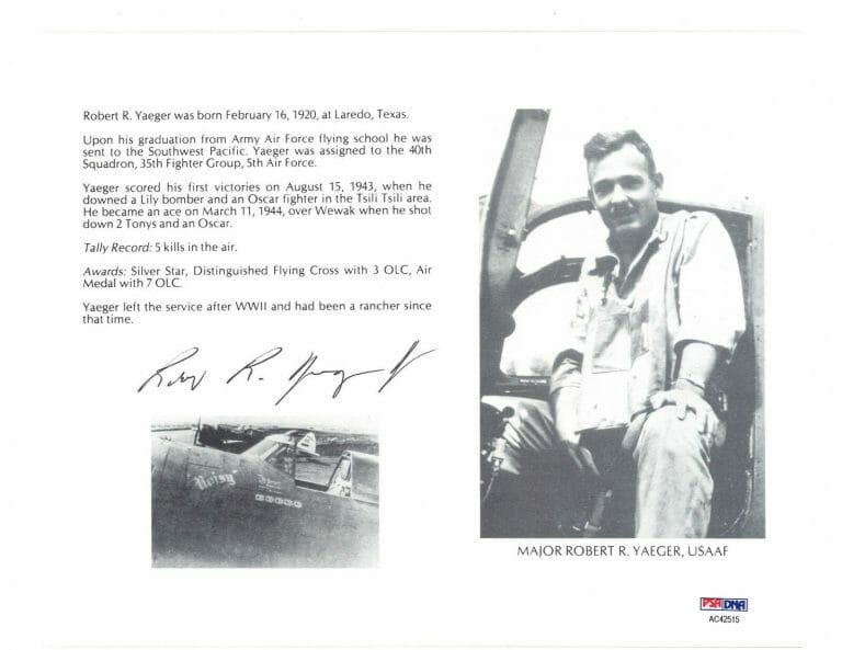 ROBERT YAEGER SIGNED 8X10 (D) PSA DNA AC42515 WWII ACE 5 KILLS COLLECTIBLE MEMORABILIA