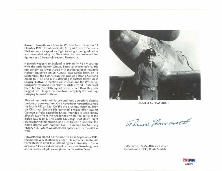 RUSSELL HAWORTH SIGNED 8X10 (D) PSA DNA AC42908 WWII ACE 5 KILLS COLLECTIBLE MEMORABILIA