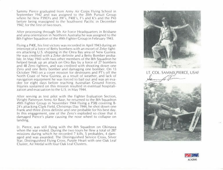 SAMMY PIERCE SIGNED 8X10 (D) PSA DNA AC42845 WWII ACE 7 KILLS COLLECTIBLE MEMORABILIA