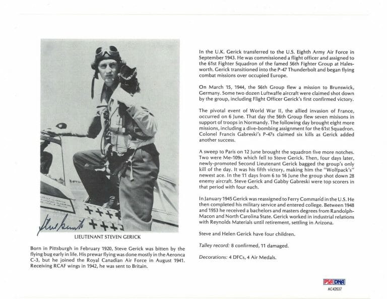 STEVEN GERICK SIGNED 8X10 (D) PSA DNA AC42637 WWII ACE 8 KILLS COLLECTIBLE MEMORABILIA