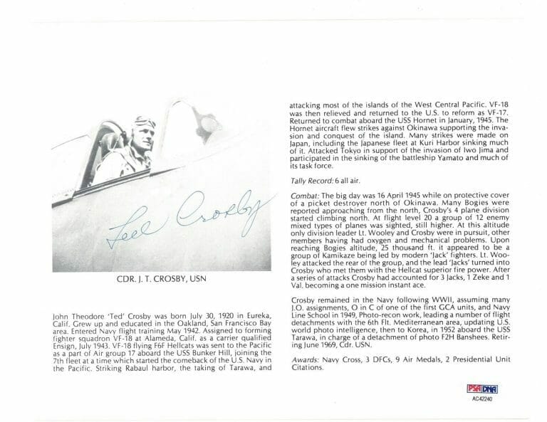TED CROSBY SIGNED 8X10 (D) PSA DNA AC42240 WWII ACE 6 KILLS COLLECTIBLE MEMORABILIA