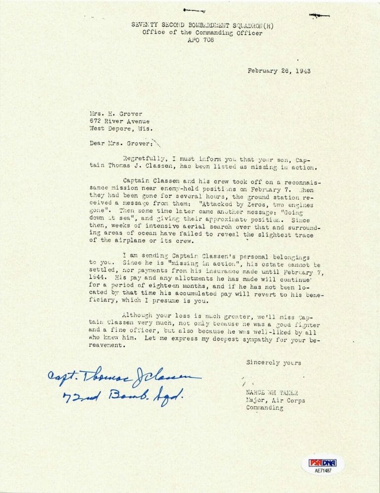 THOMAS CLASSEN SIGNED PSA DNA AE71487 (D) WWII MIA LETTER 509TH COMP GROUP COLLECTIBLE MEMORABILIA