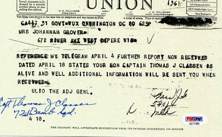 THOMAS CLASSEN SIGNED WESTERN UNION DOCUMENT PSA DNA AE71486 (D) WWII 72ND BS COLLECTIBLE MEMORABILIA