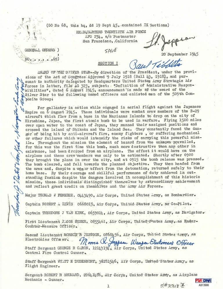 TIBBETS / VAN KIRK / JEPPSON SIGNED SILVER STAR DOCUMENT PSA DNA AB13906 COLLECTIBLE MEMORABILIA