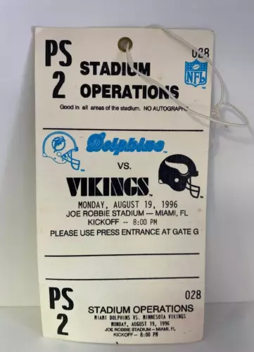 VINTAGE 1996 MIAMI DOLPHINS VS MINNESOTA VIKINGS STADIUM OPERATIONS PASS COLLECTIBLE MEMORABILIA