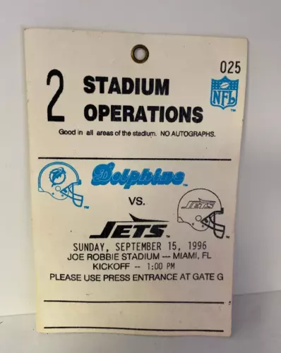VINTAGE 1996 MIAMI DOLPHINS VS NEW YORK JETS STADIUM OPERATIONS PASS COLLECTIBLE MEMORABILIA