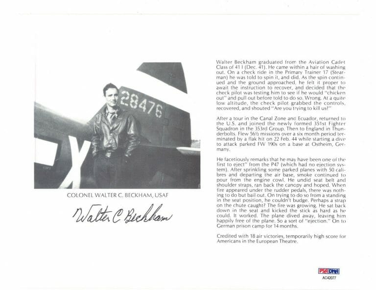 WALTER BECKHAM SIGNED 8X10 (D) PSA DNA AC42077 WWII ACE 18 KILLS COLLECTIBLE MEMORABILIA